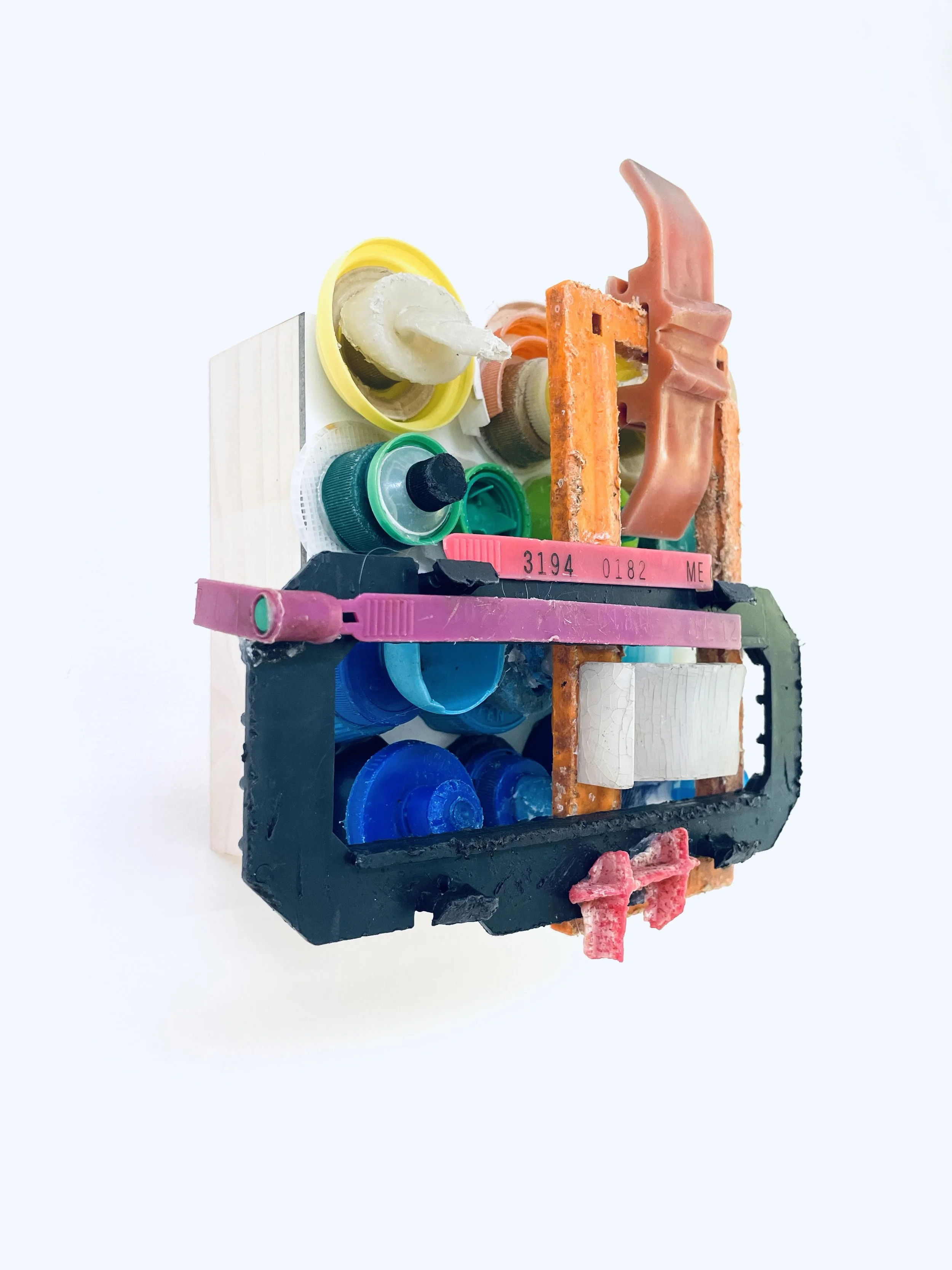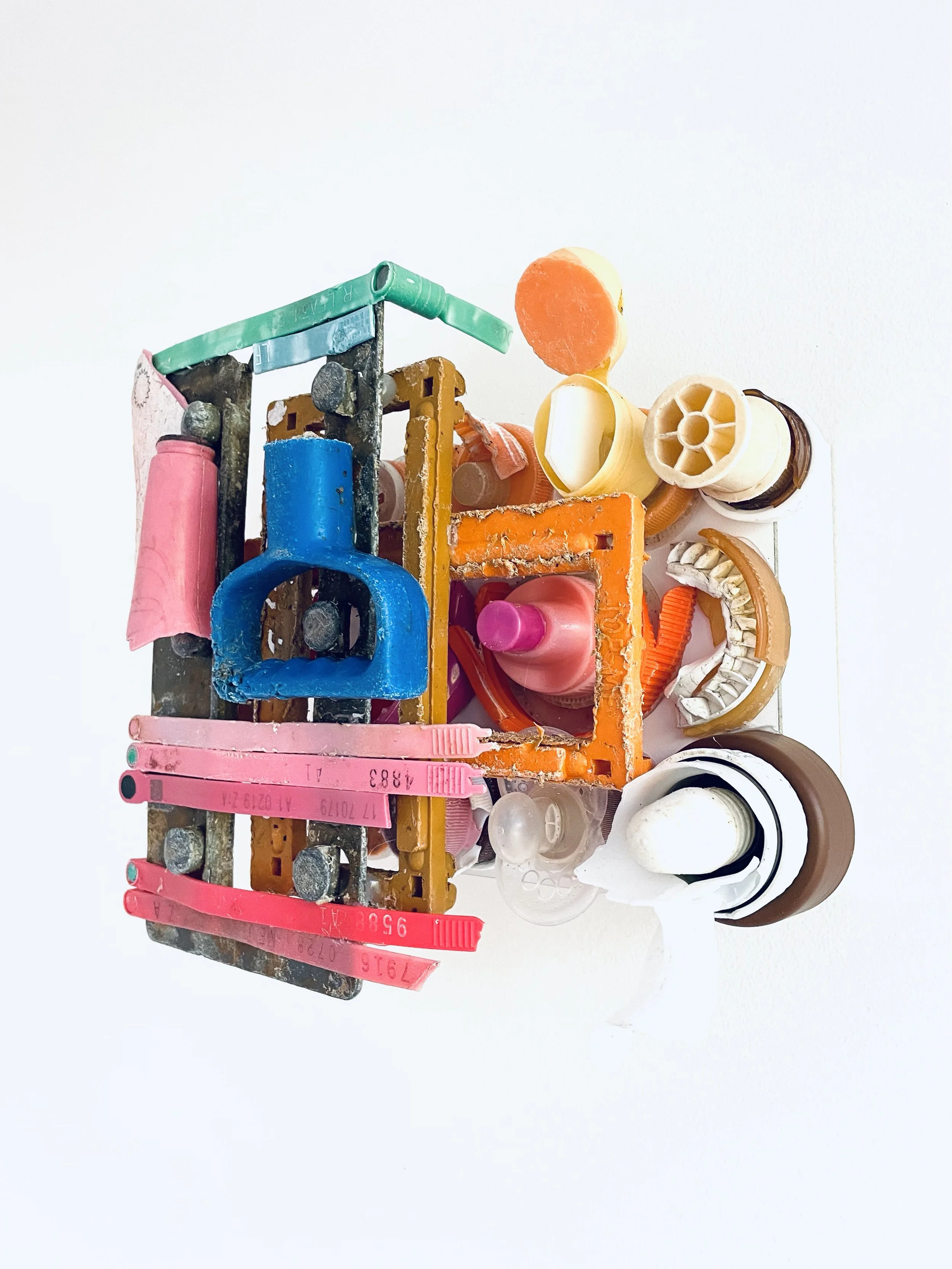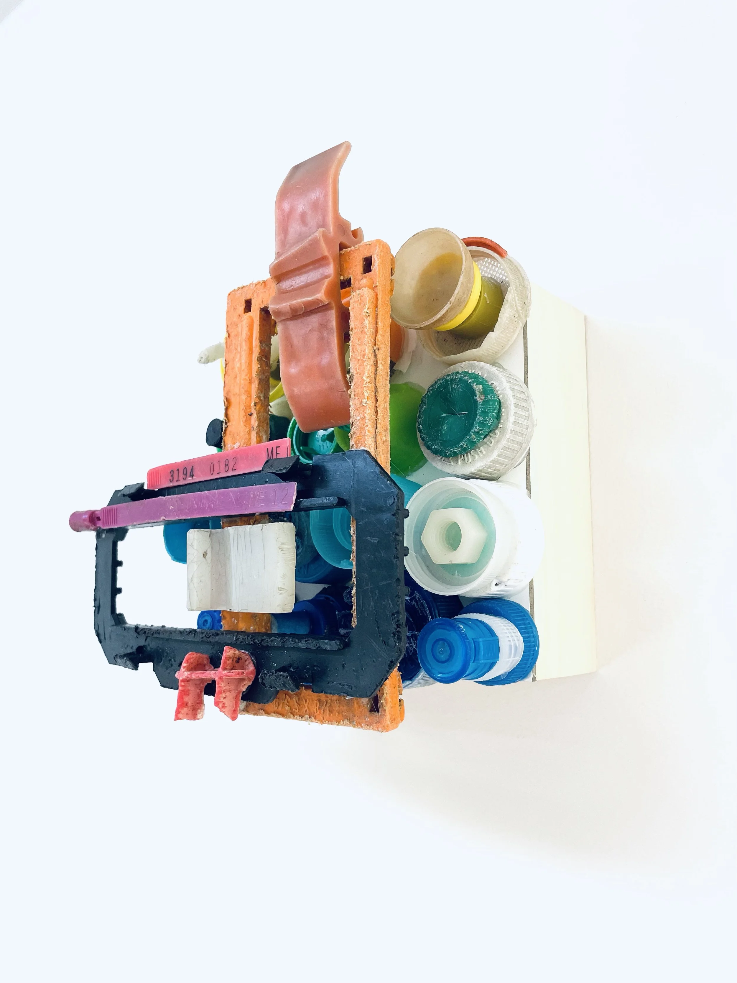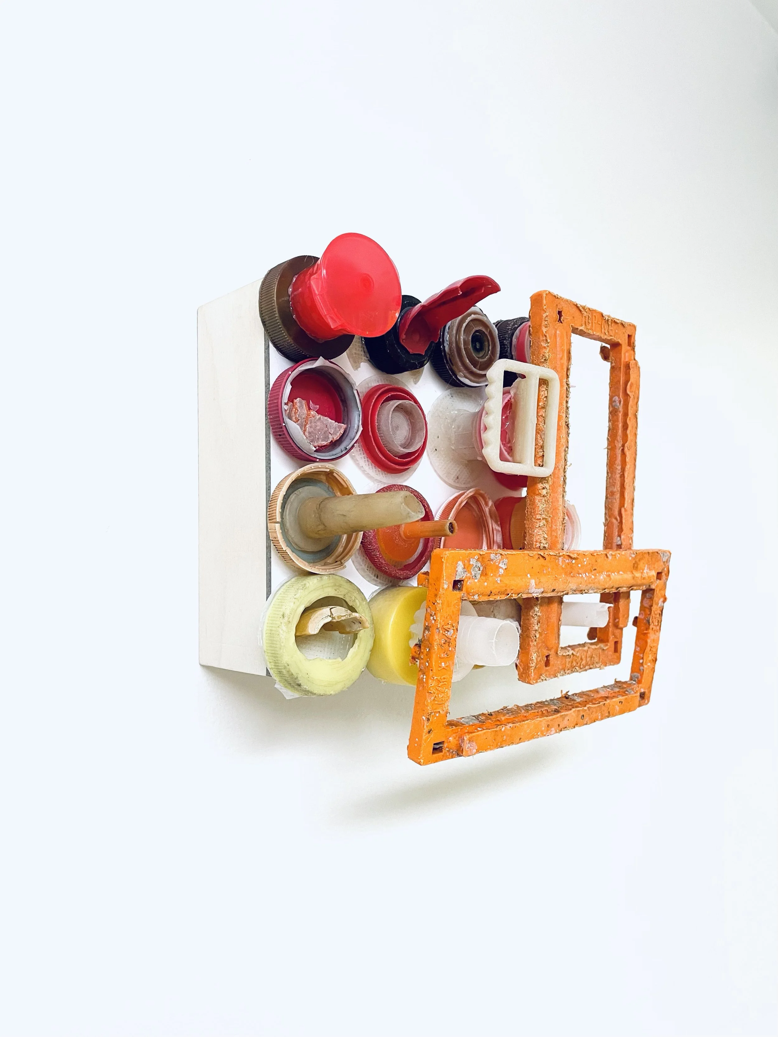found objects on board, 8” x 8”