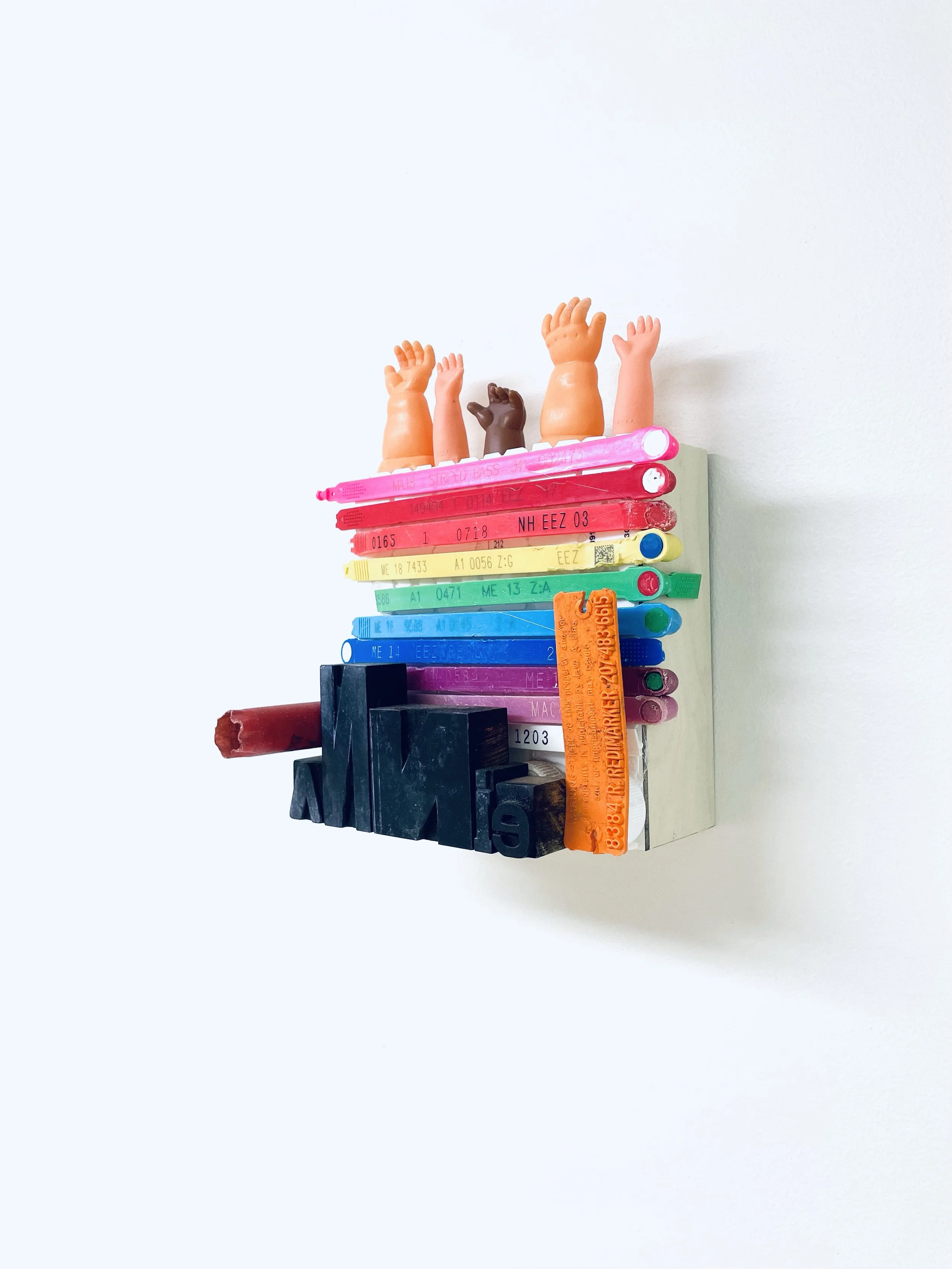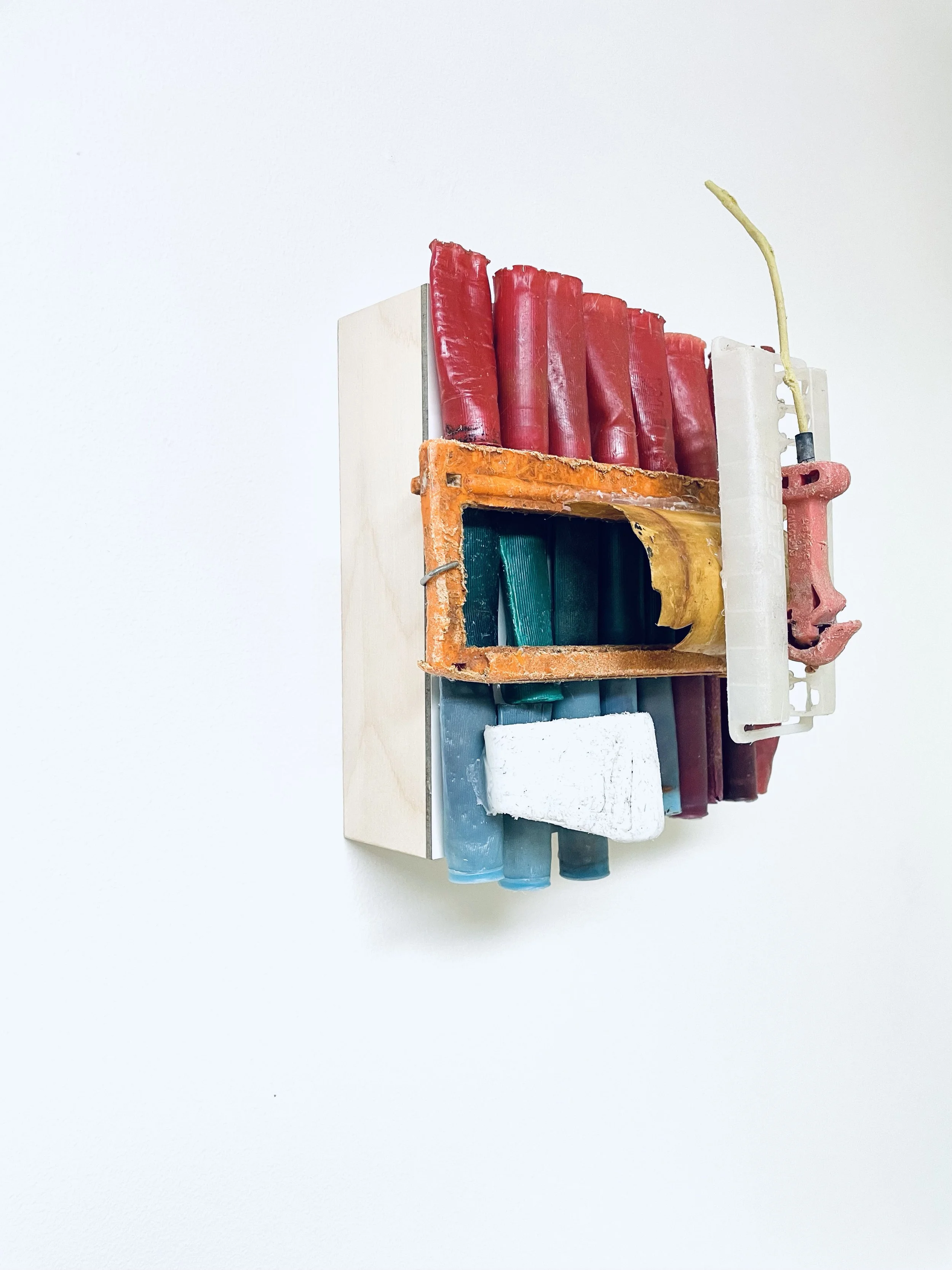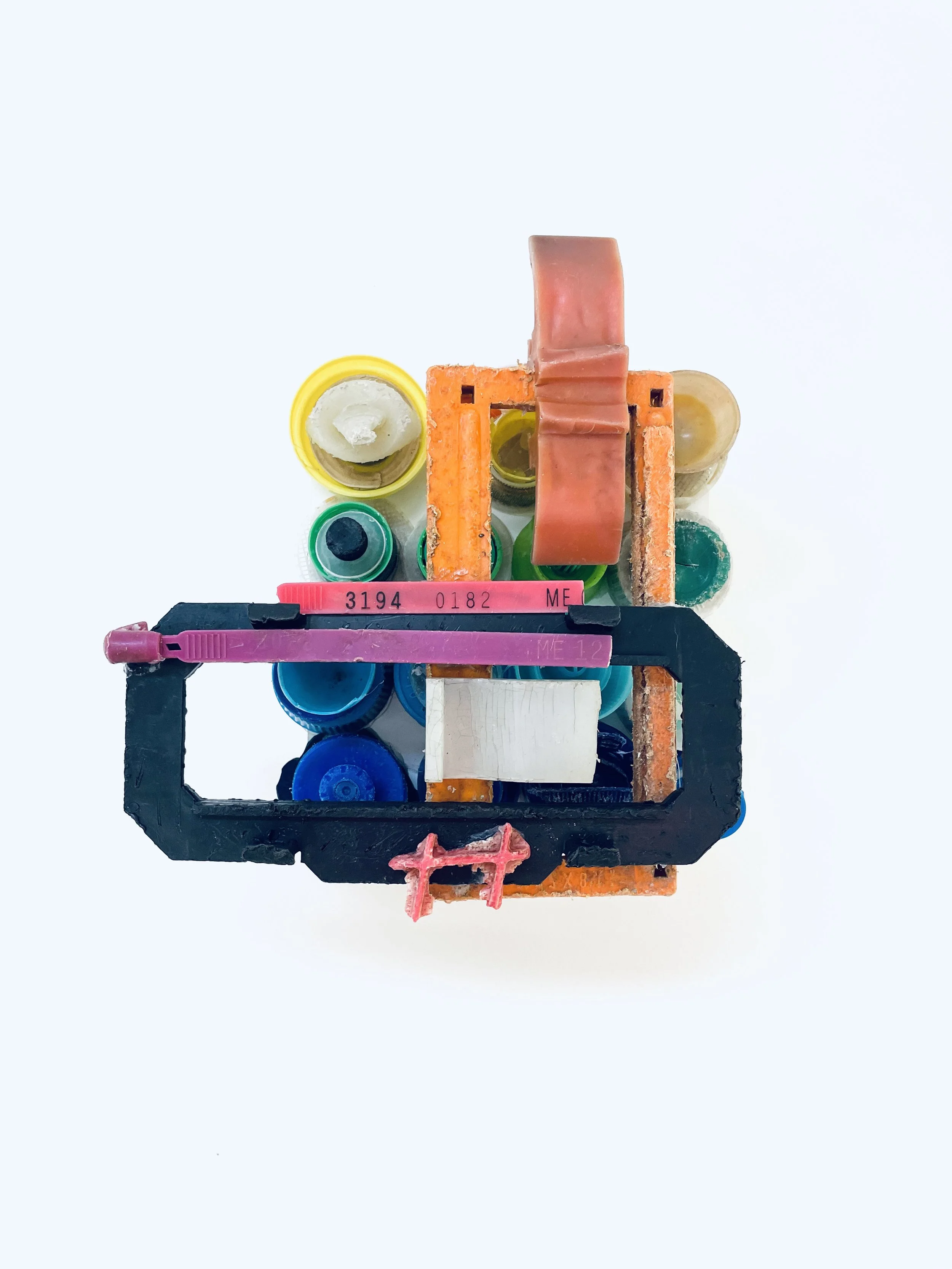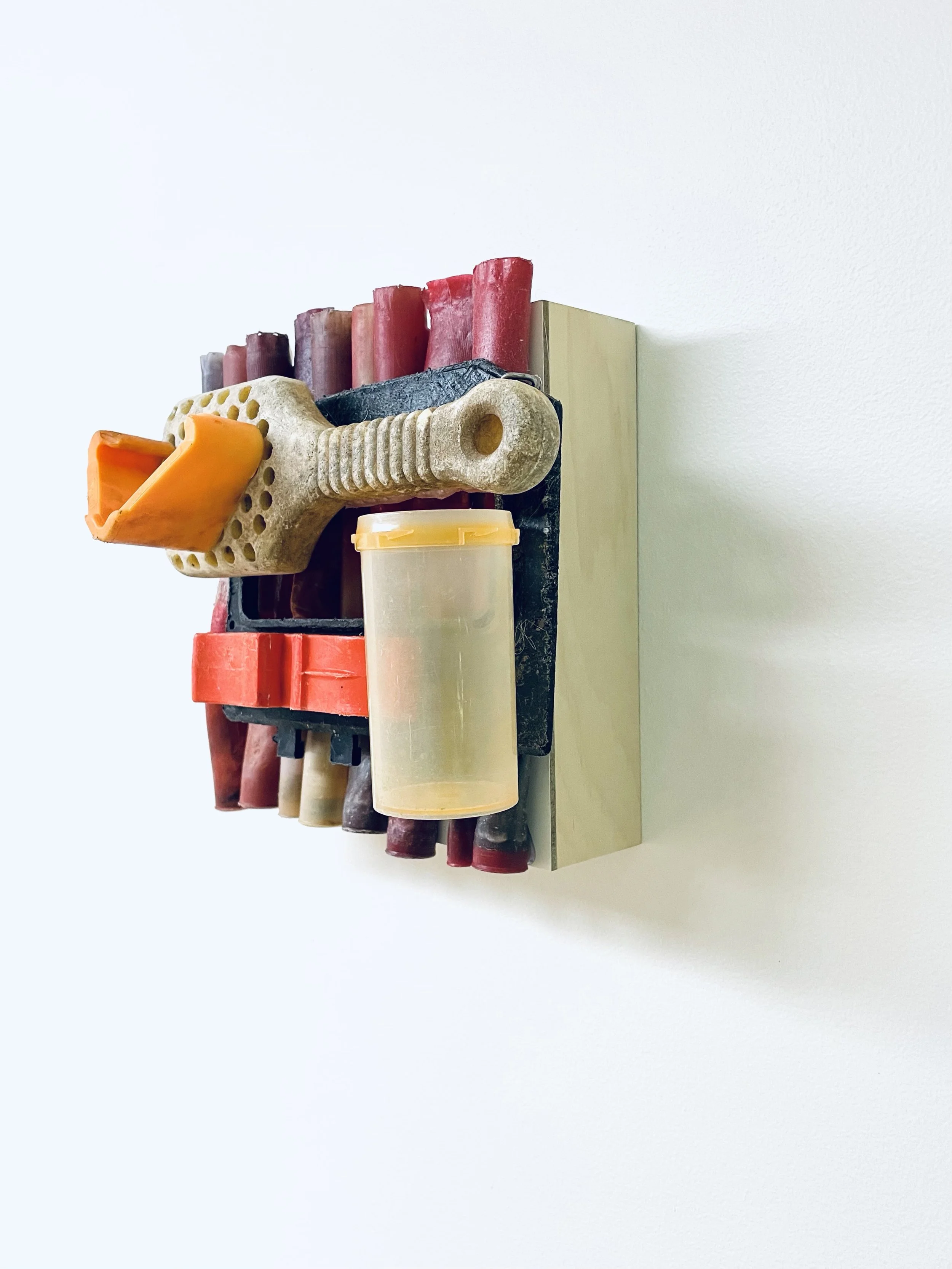 found objects on board, 8” x 8”