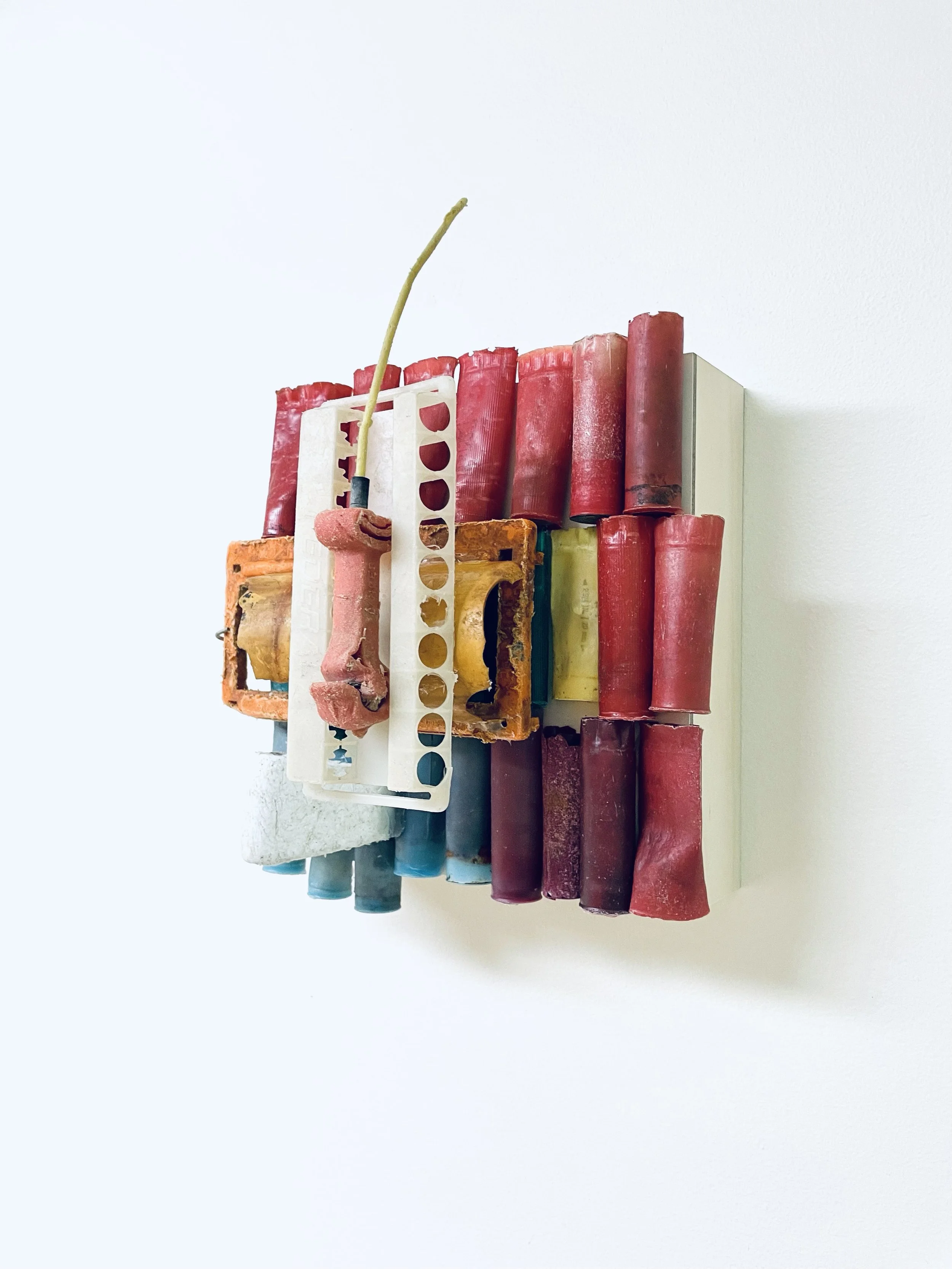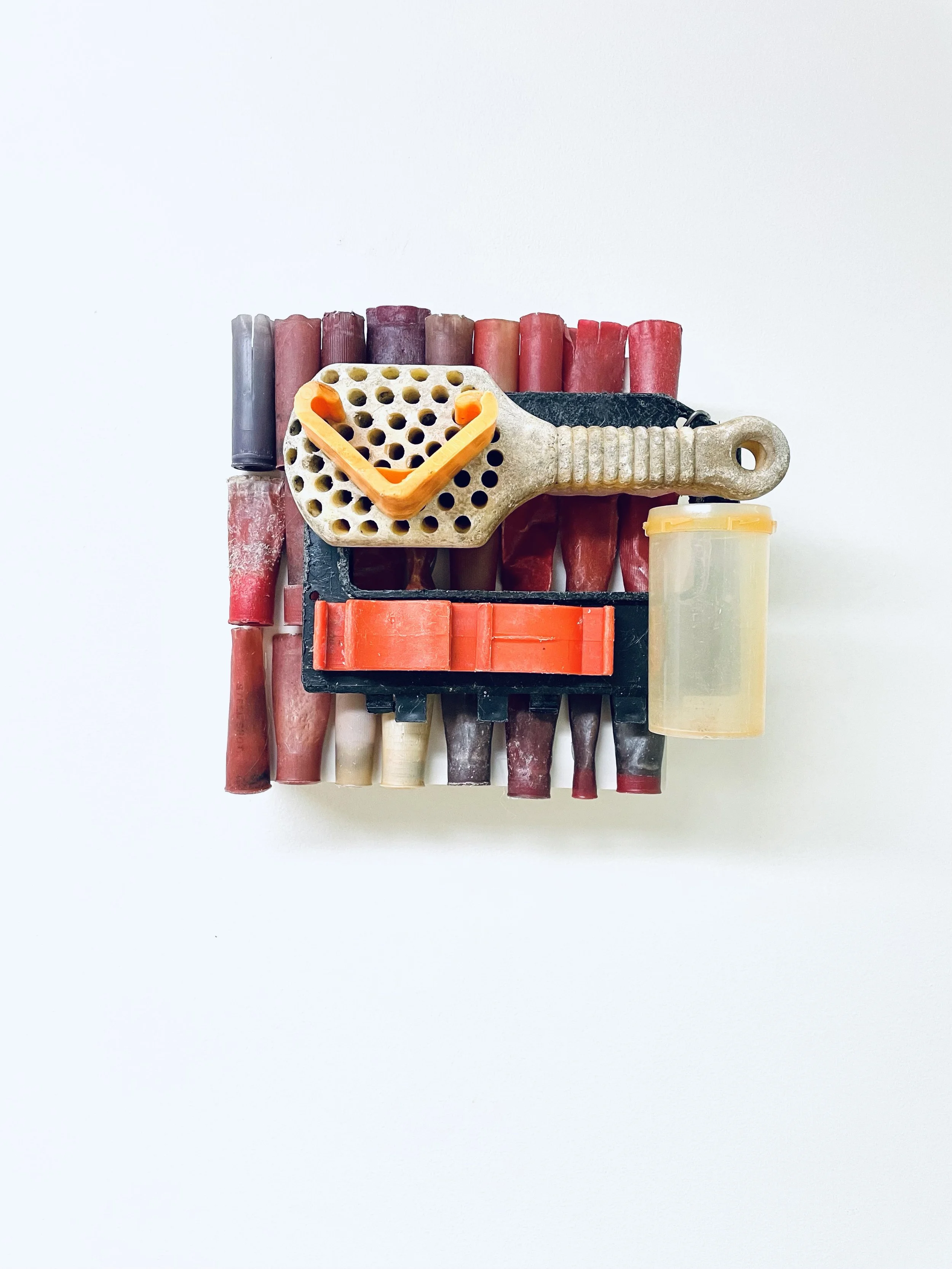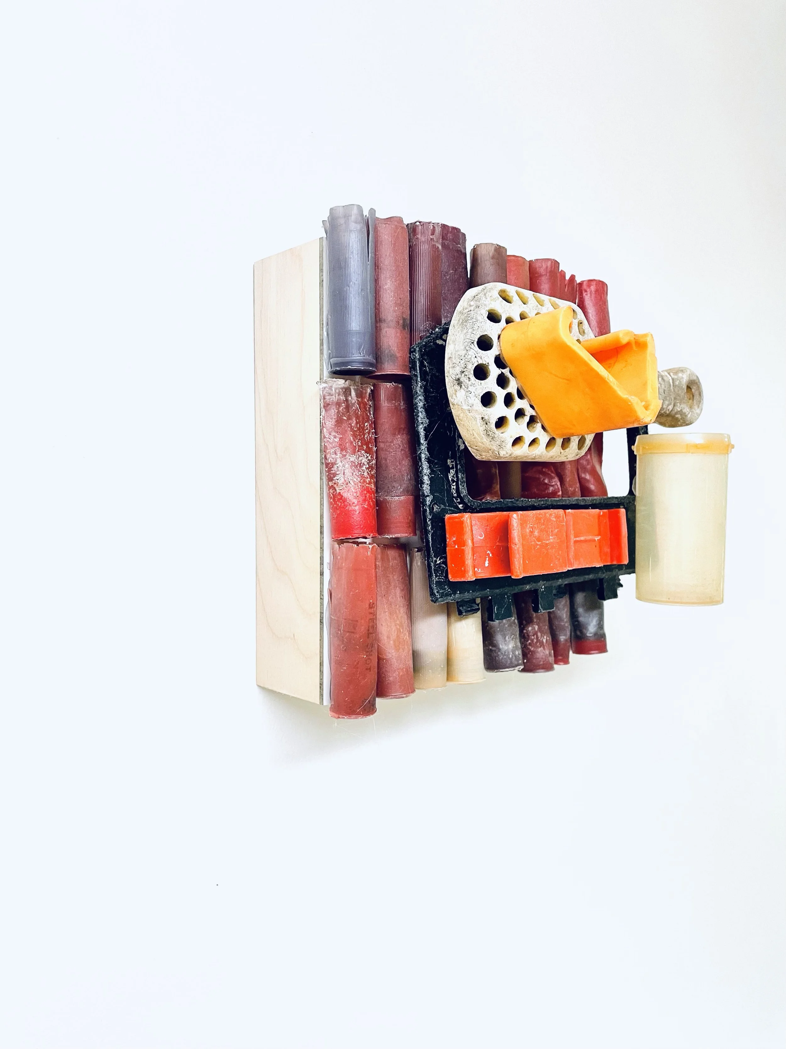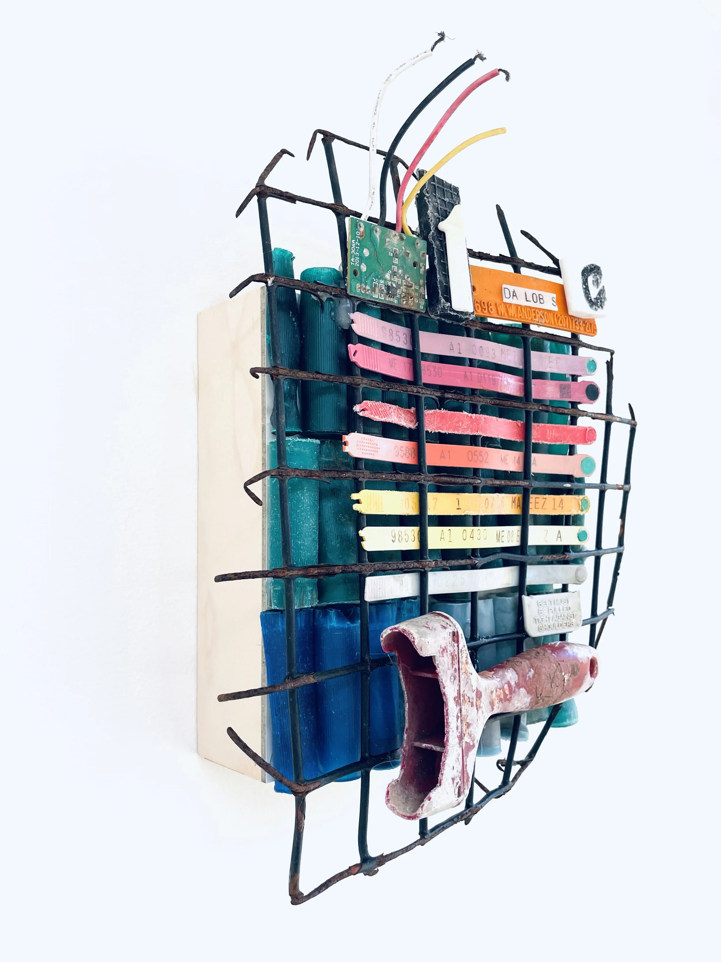 found objects on board, 12” x 12”