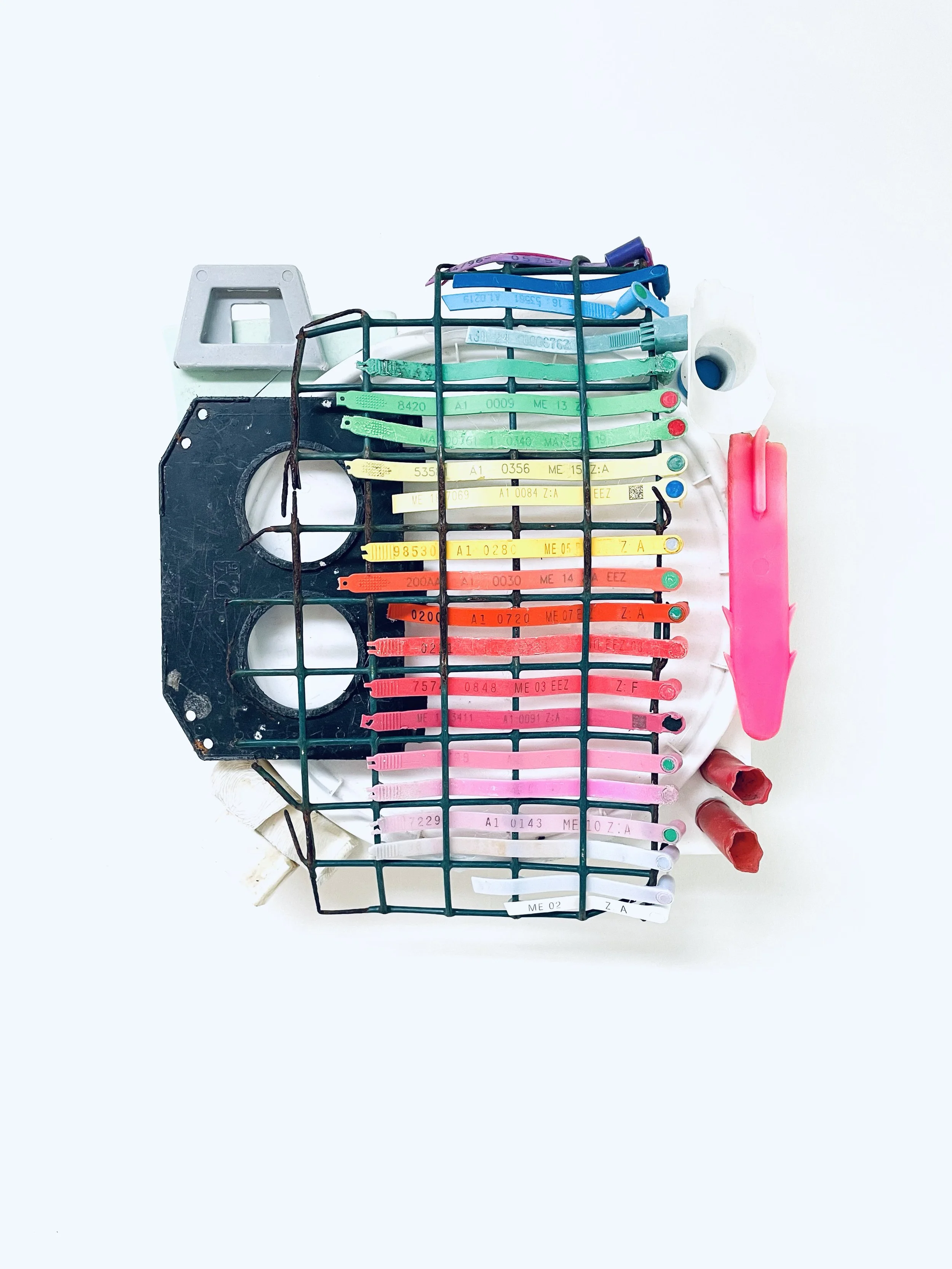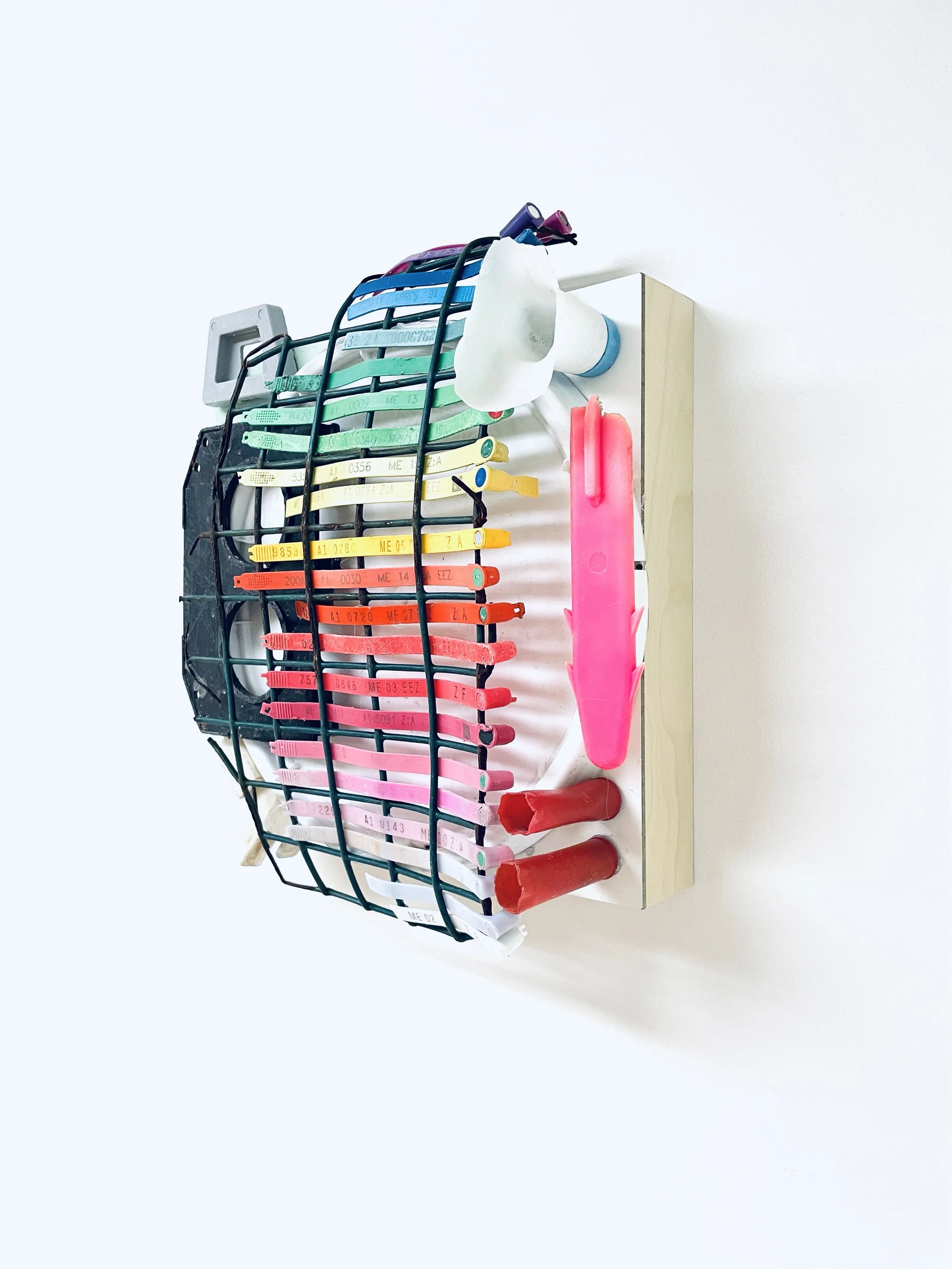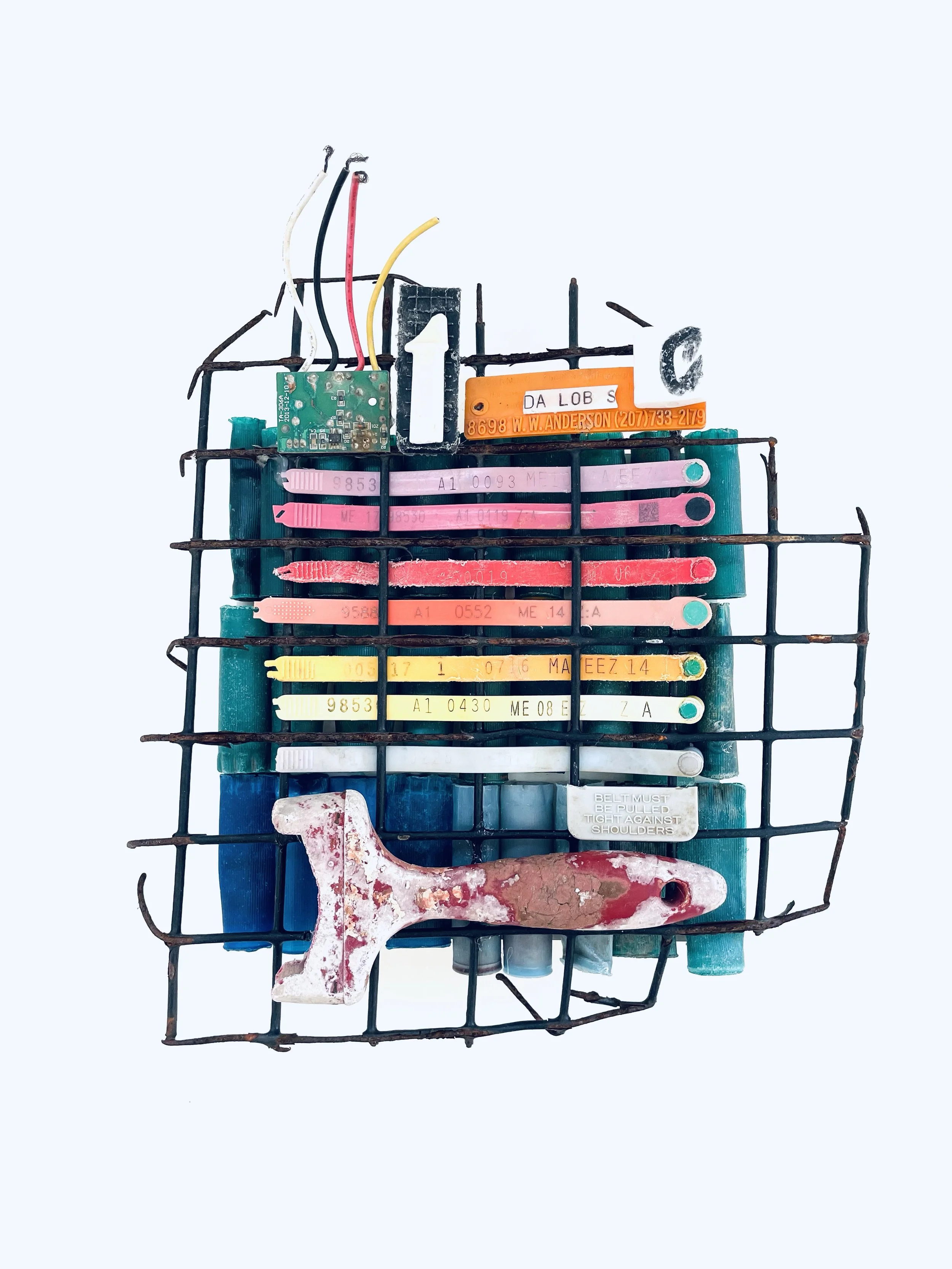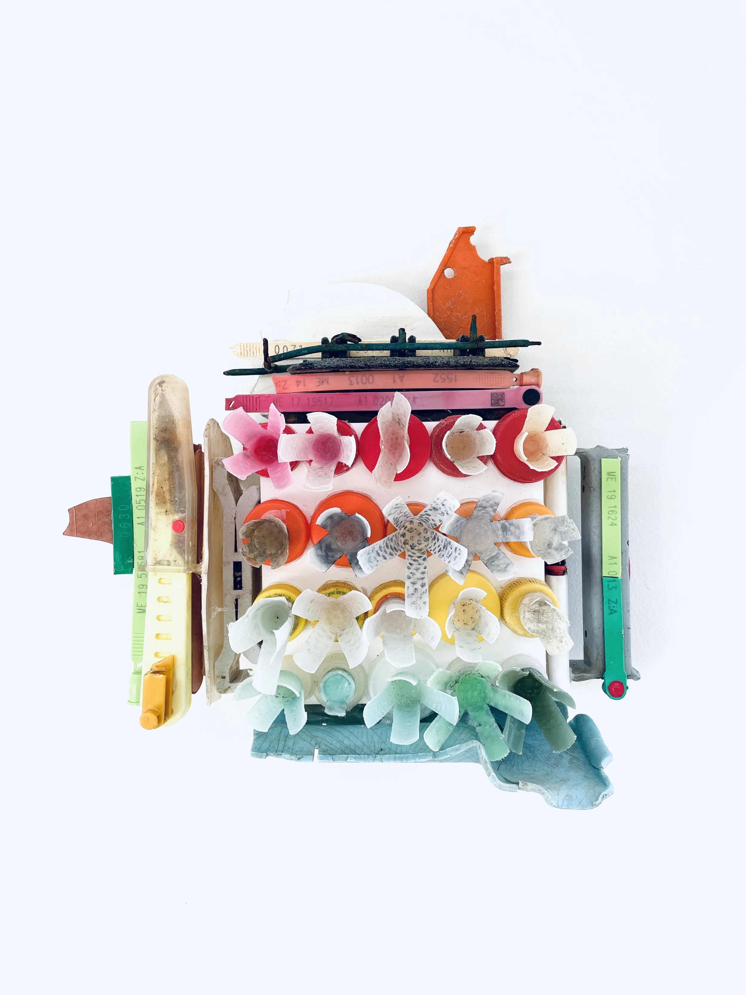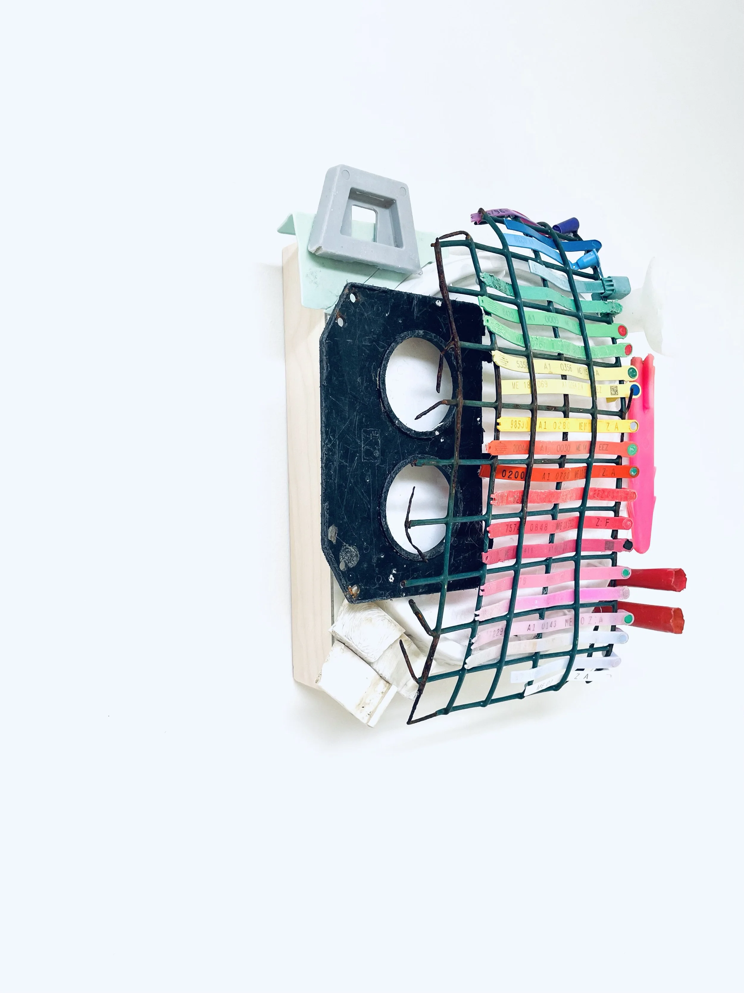 found objects on board, 12” x 12”
