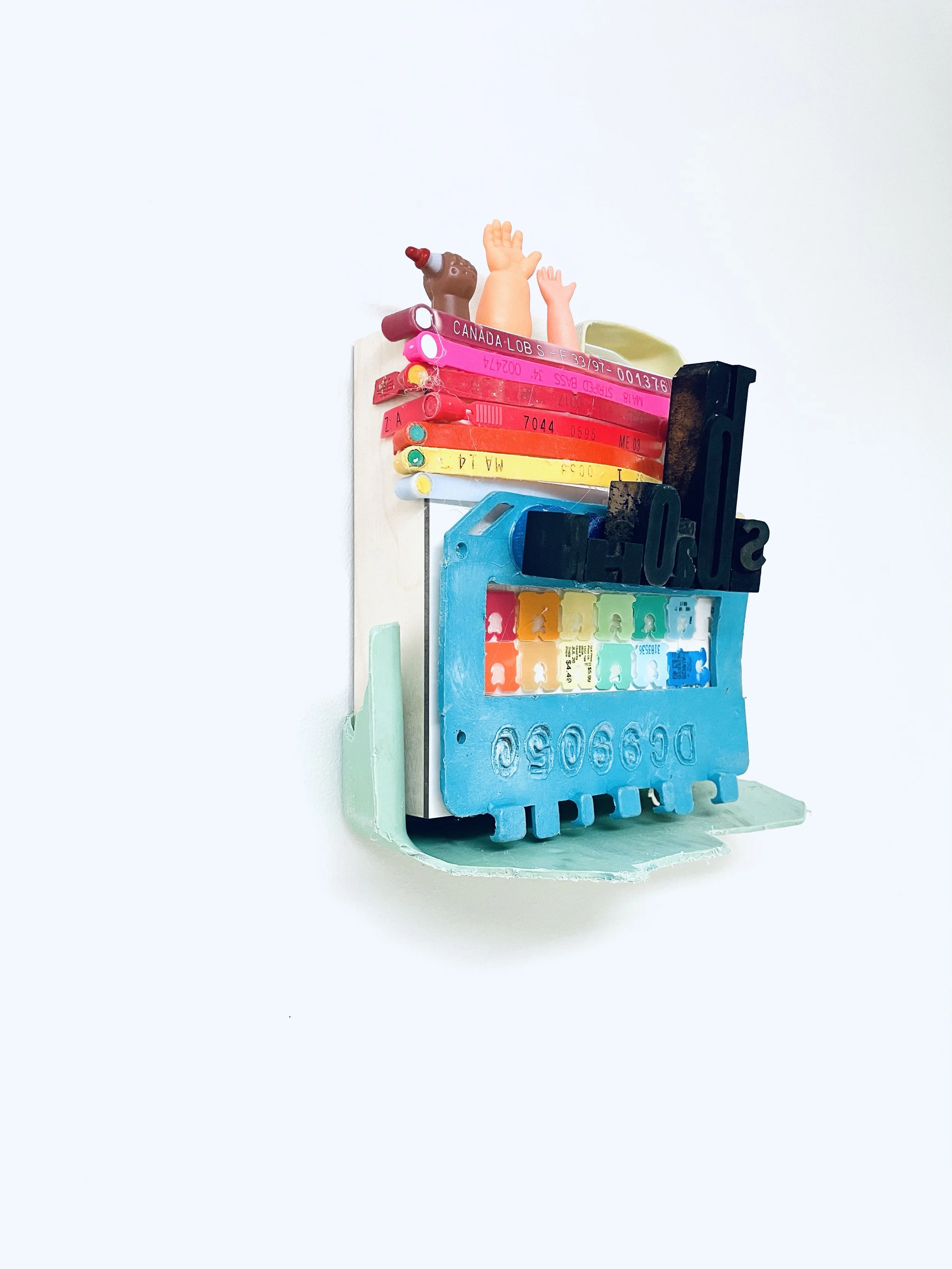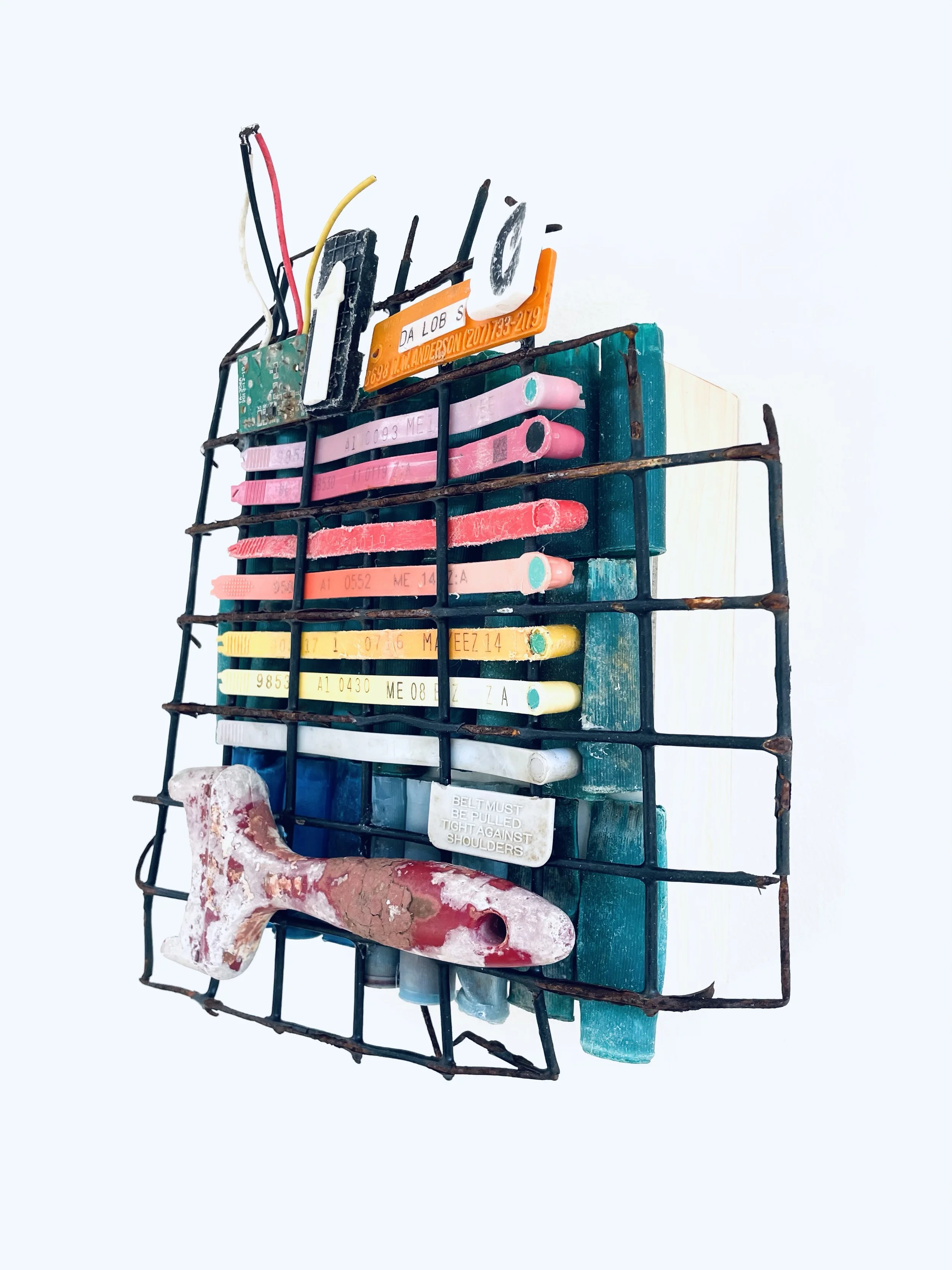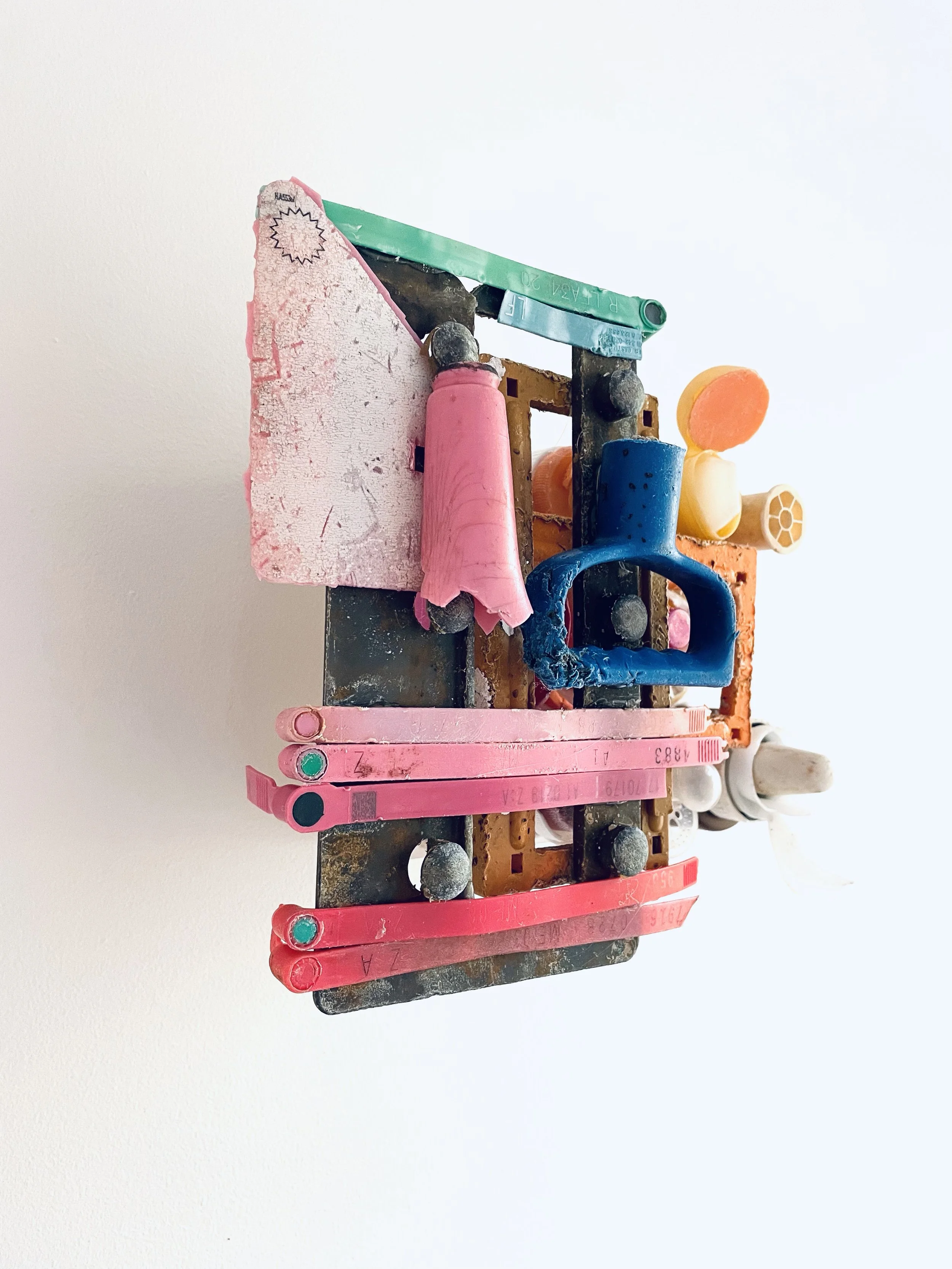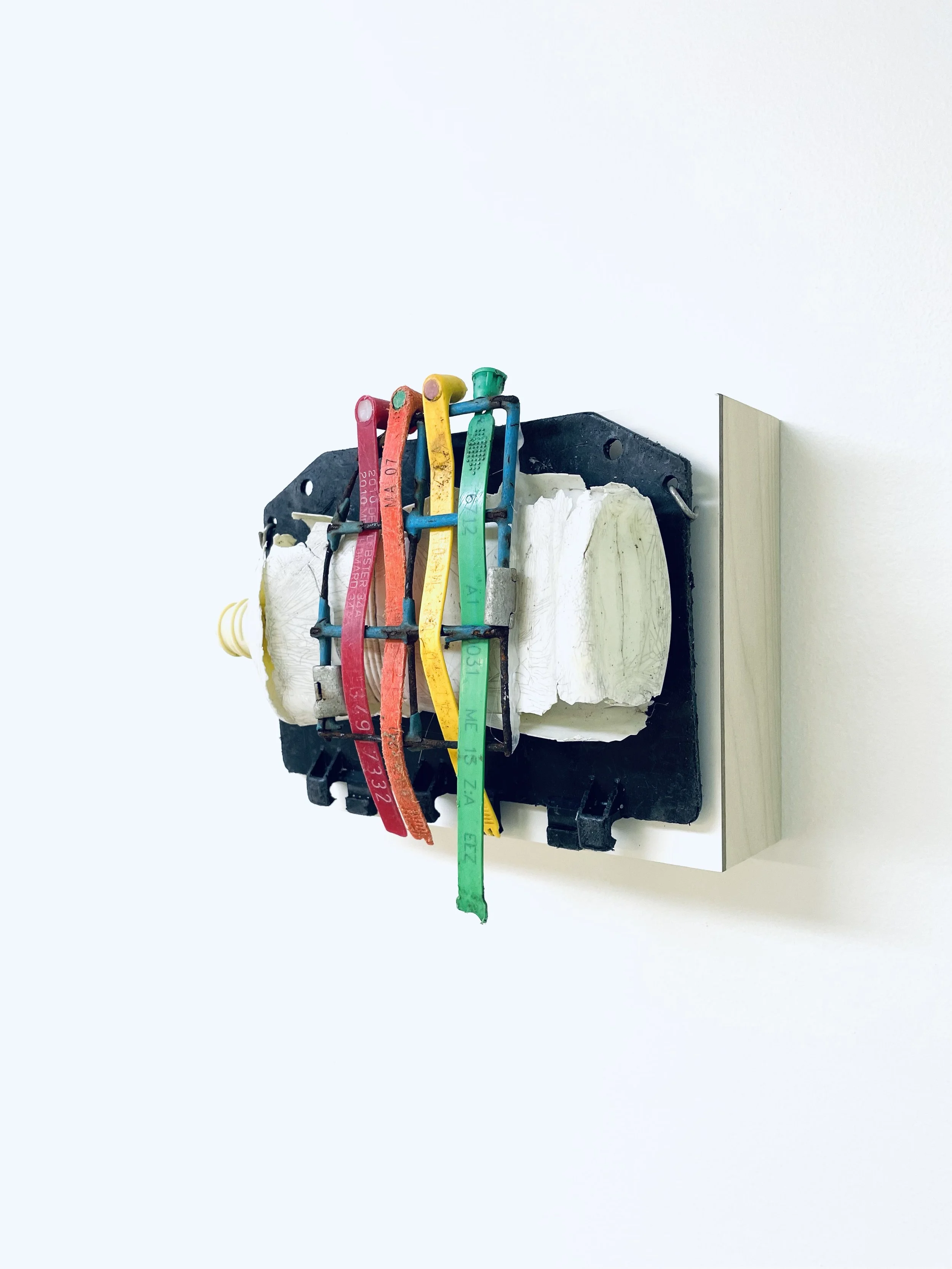 found objects on board, 6” x 8”
